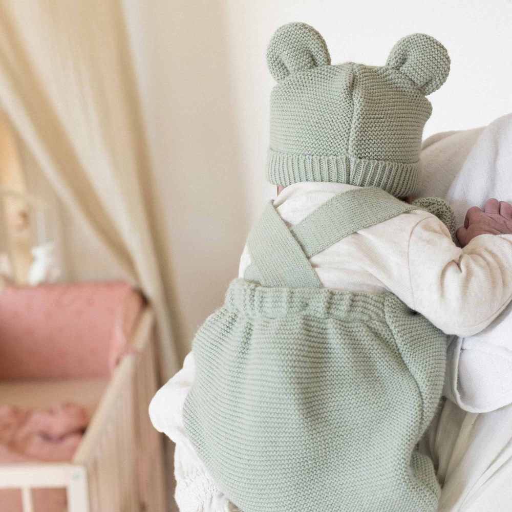 Erhältlich in vier eleganten Farben, Salbei, Karamell, Altrosa und Sand, passt dieser Latzhose perfekt zum Strick-Wickelbody, den Babyschuhen oder den passenden Mützen für einen kompletten und raffinierten Look. Sein zeitloses Design macht ihn zu einem unisex Stück, perfekt für einen kleinen Jungen oder ein kleines Mädchen.