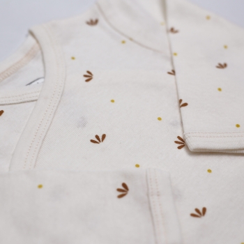 The set of 2 long sleeve baby bodysuits is the perfect accessory for young parents looking for comfort and practicality for their child. Made of OEKO-TEX® STANDARD 100 cotton, these bodysuits ensure unparalleled softness and maximum safety for babies' sensitive skin. Available in beige with a caramel pattern, these baby bodysuits are not only elegant but also unisex, suitable for both girls and boys. The "Mini Nous" inscription adds an adorable and trendy touch, making these clothes even more attractive.