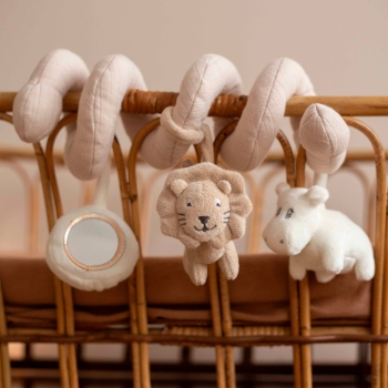 This spiral is designed to easily adapt to all types of supports: crib, playpen, car seat or stroller. Its great versatility allows parents to use it at home or on the go, making it a practical, multifunctional accessory. The beige and ecru color scheme, neutral and timeless, fits perfectly in childcare stores where aesthetics is a key purchasing criterion for young parents.