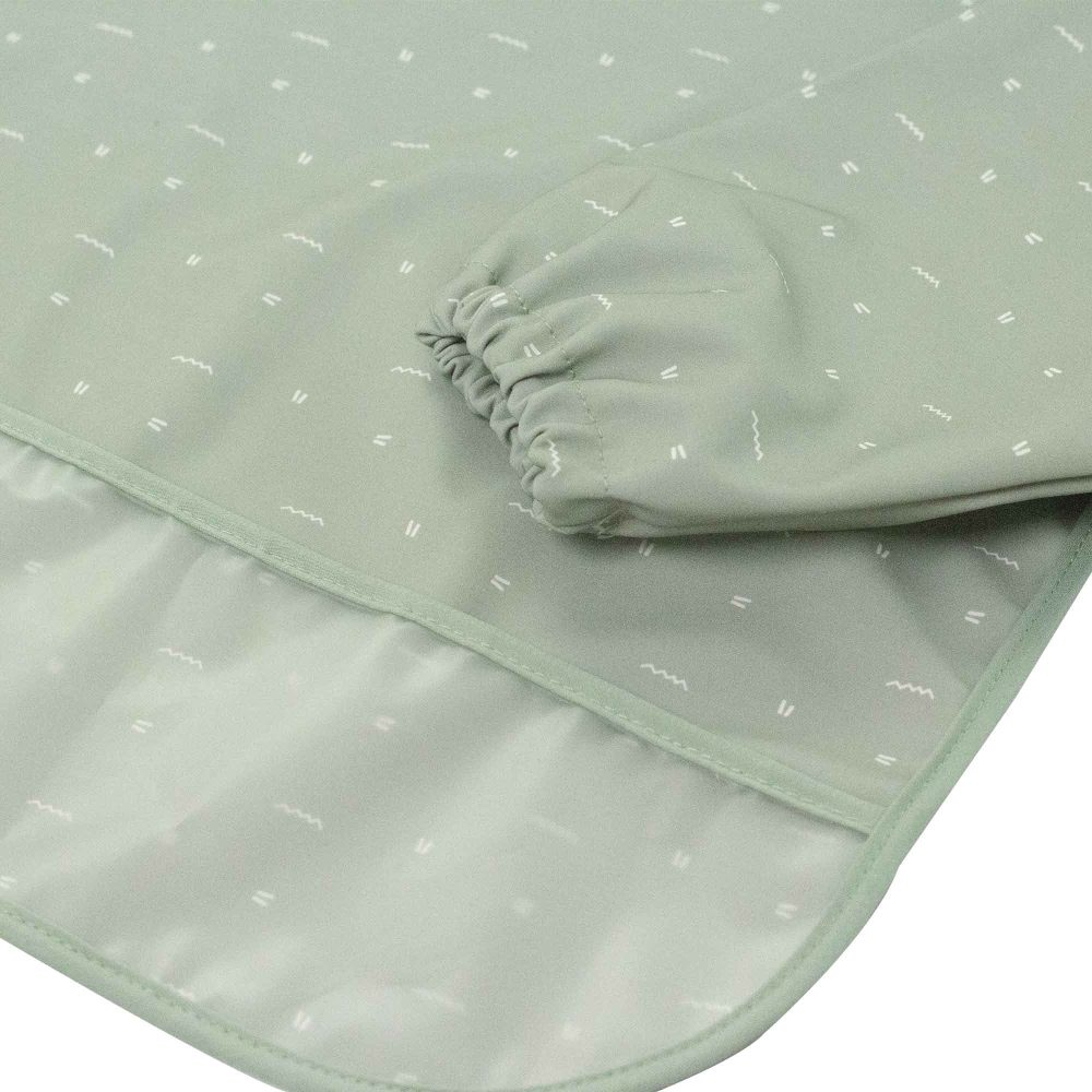 This long-sleeved baby bib apron provides optimal protection for the child during meals. Made from 100% plastic-coated material, it is completely waterproof and stain-resistant. It can be cleaned with a simple wipe of a sponge or machine washed at 30°C.