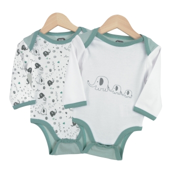 ¡Los motivos elefante de los 2 bodies harán de tu pequeño el más bonito!