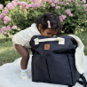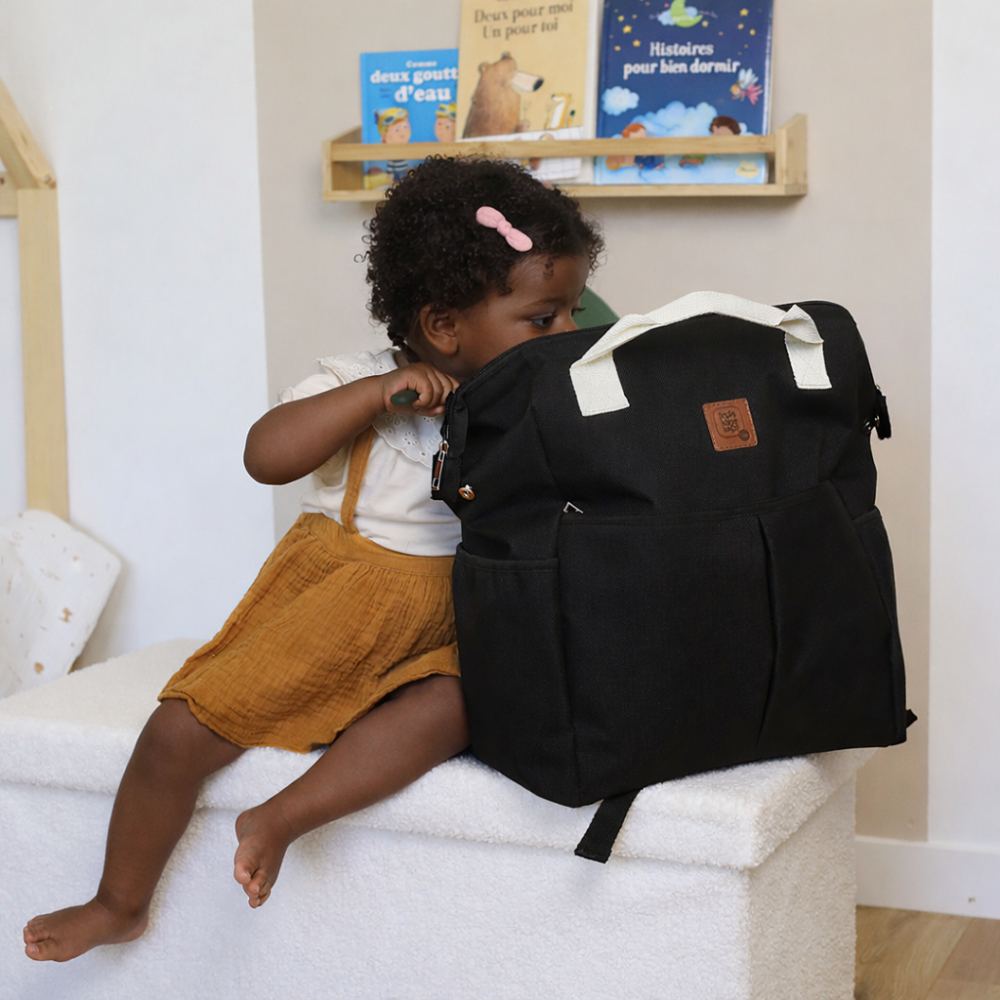 Perfecto para los desplazamientos, este bolso se fija fácilmente en un cochecito o una maleta gracias a sus enganches y su pasador integrado. Su respaldo acolchado y sus tirantes ajustables aseguran un porte cómodo, incluso bien lleno.