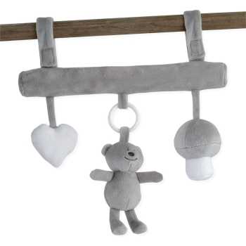 Esta barra de actividades gris permitirá a tu pequeño despertar todos sus sentidos. Con su pequeño corazón blanco, su champiñón y su osito colgantes, esta barra de actividades te enamorará sin duda. Cada uno de los elementos suspendidos cuenta con características sensoriales únicas con diferentes texturas y formas atractivas, que fomentan la exploración y la manipulación. La barra de actividades está confeccionada en terciopelo gris suave, ofreciendo una textura táctil relajante para las manitas de tu bebé. La barra de actividades se puede sujetar a un cochecito o a los barrotes de la cuna del bebé.