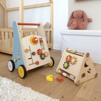 Este carrito andador de madera natural certificada FSC® está diseñado para acompañar al bebé desde los 12 meses en sus primeros pasos y su desarrollo. Multifunción, estimula la motricidad, la creatividad y el reconocimiento de formas gracias a sus numerosas actividades integradas.