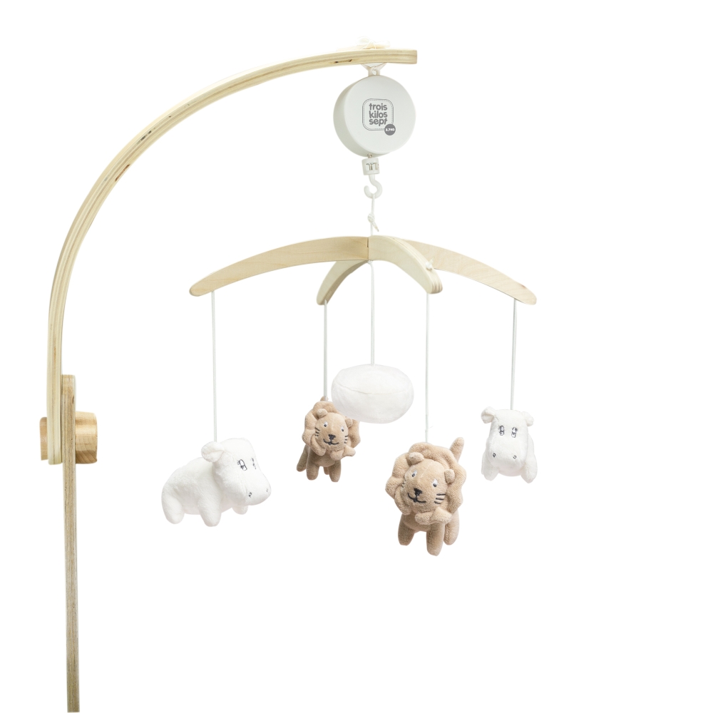 Este móvil musical está diseñado para seducir a los jóvenes padres por su diseño moderno y sus materiales de calidad. Compuesto por dos leones y dos hipopótamos suspendidos, presenta colores suaves que crean un ambiente relajante para el bebé. El pie y el brazo de madera natural añaden un toque elegante, adaptándose perfectamente a diferentes ambientes de habitación.
