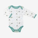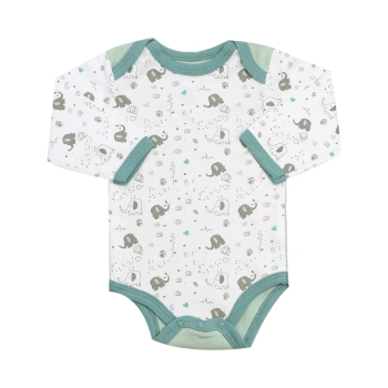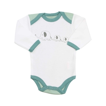 Découvrez notre lot de 2 bodies éléphant à manches longues. Avec leur ouverture à emmanchure américaine, vous pourrez simplement passer le body à travers la tête de votre bébé. Cela permet de ne pas avoir à enlever complètement le body lors d'un changement de couche grâce aux 3 bouton-pression présents à l'entrejambe. Les manches longues permettent également de bien couvrir les bras de votre bébé pour le garder bien au chaud. Le premier body blanc est recouvert de petits éléphants gris et blancs. Il comporte également des touches de vert. Le deuxième body est blanc avec 3 motifs éléphant sur le devant. L'arrière du body est vert clair avec des manches blanches.