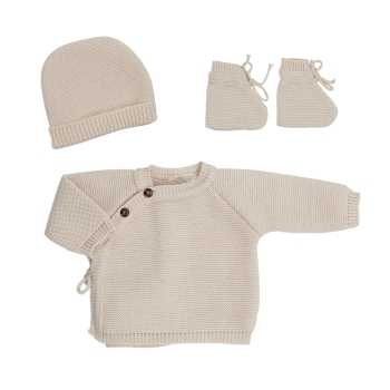 Pouponnez bébé avec douceur et confort. Ce lot brassière, chaussons et bonnet en maille sera parfait pour les premiers jours de votre bébé.