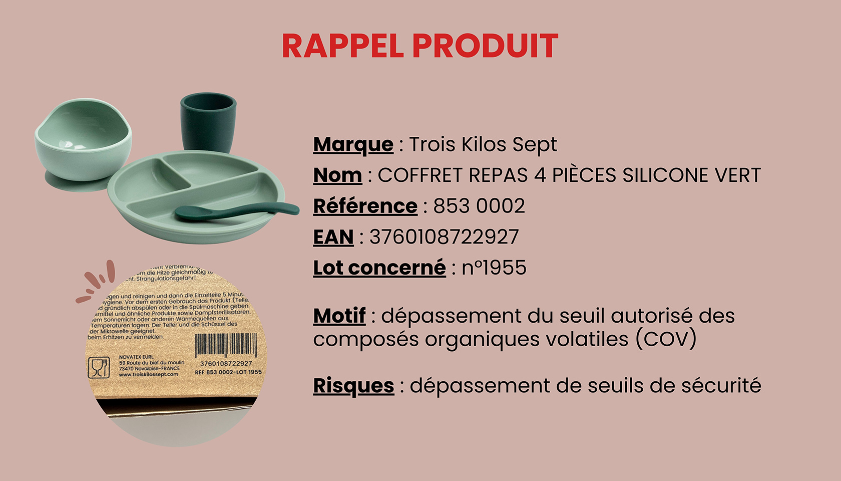 [RAPPEL DE PRODUIT - coffret repas 4pièces silicone réf.853 0002-Lot n°1955]