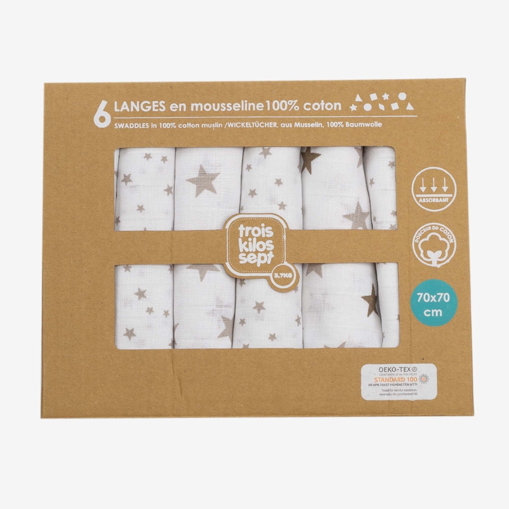Lot de 6 langes bébé Oeko-Tex - étoiles grises %separator% %shop-name%
