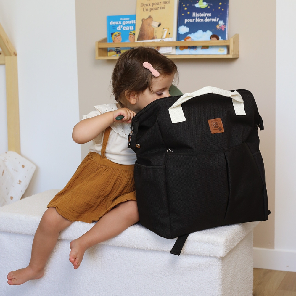 Léger, compact (30 x 15 x 42 cm), avec un dos renforcé et des bretelles réglables, il est confortable à porter. Son design noir sobre, discret et facile à assortir, plaît à une large cible. Sa matière déperlante résiste aux petites éclaboussures du quotidien, un vrai plus pour les parents.