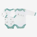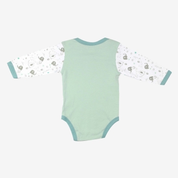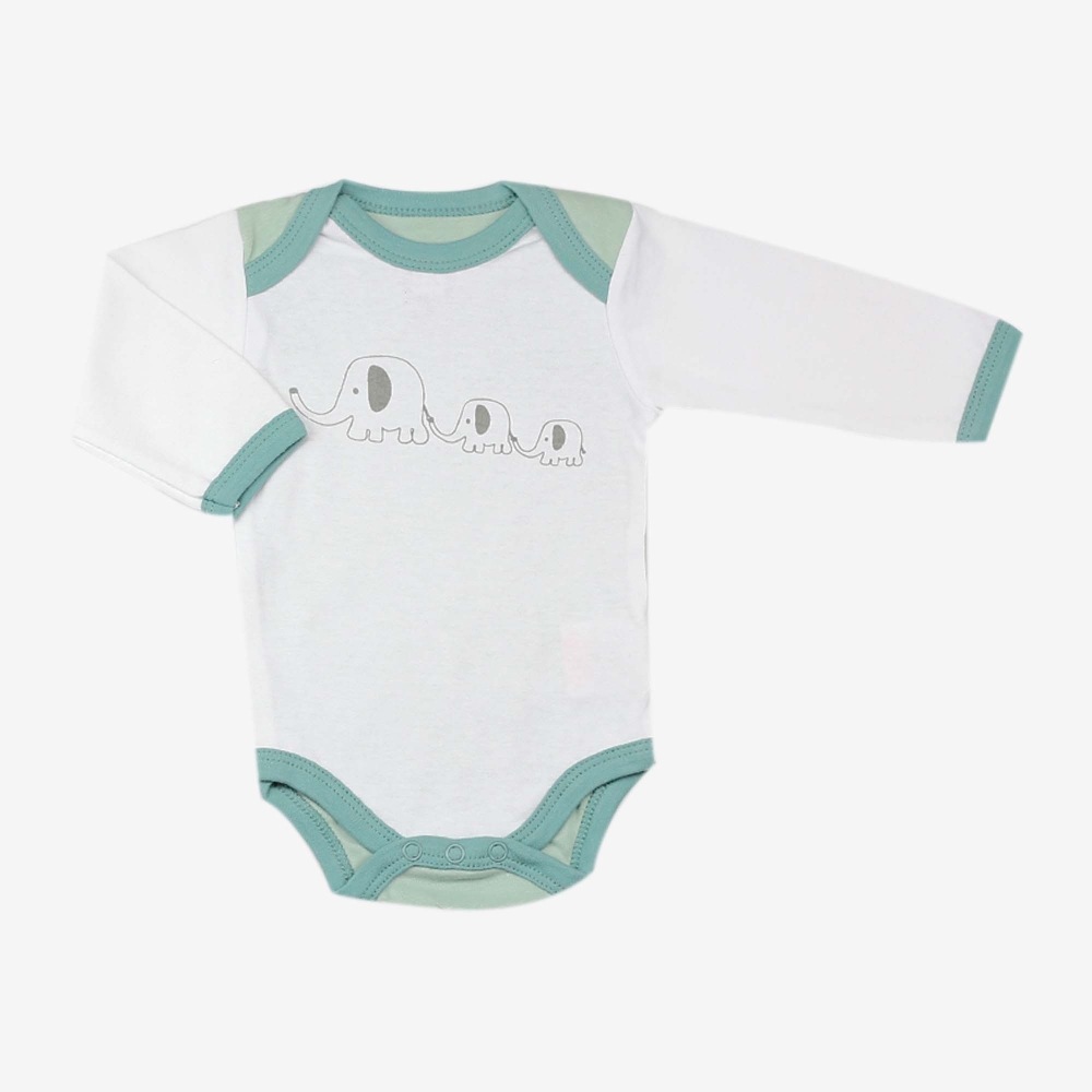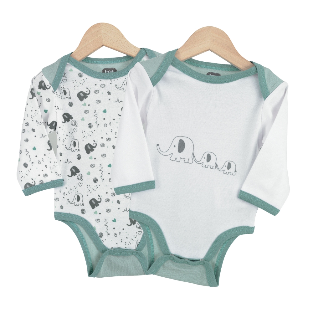 Scopri il nostro set di 2 body elefante a maniche lunghe. Con la loro apertura a spalline all'americana, potrai semplicemente far passare il body attraverso la testa del tuo bambino. Questo permette di non dover rimuovere completamente il body durante il cambio del pannolino grazie ai 3 bottoni a pressione presenti all'inguine. Le maniche lunghe permettono anche di coprire bene le braccia del tuo bambino per tenerlo al caldo. Il primo body bianco è ricoperto di piccoli elefanti grigi e bianchi. Presenta anche dei tocchi di verde. Il secondo body è bianco con 3 motivi elefante sul davanti. Il retro del body è verde chiaro con maniche bianche.
