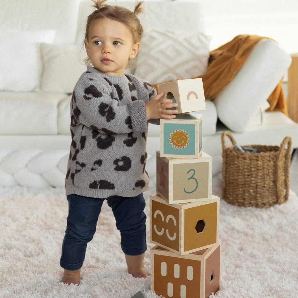 Scopri i nostri 5 cubi impilabili in legno certificati FSC® che permettono al bambino di creare una torre alta quasi 60cm.